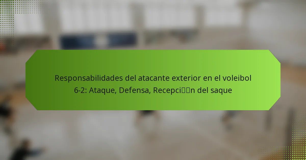 Las responsabilidades principales de un atacante exterior en un sistema de voleibol 6-2 incluyen atacar, defender y participar en la recepción del saque. Esta posición es crucial tanto para las jugadas ofensivas como para las estrategias defensivas, requiriendo un conjunto de habilidades versátil para adaptarse a diversas situaciones de juego.
